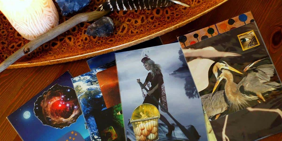 In each Card-Making Studio, you will make one to three cards, and over time may indeed make an entire deck of your own oracle cards, excavated from your soul. No special artistic talent is necessary. All human earthlings have this capacity to cut and paste, to listen, and to voice themselves. Art materials, supplies, images and instruction included.