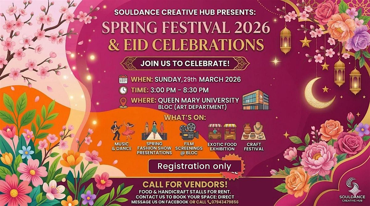 Souldance Creative Hub London is celebrating The spring festival 2026 and Eid Celebrations at Queen Mary University Bloc with the community on 29th March From 3pm to 8pm .We want to invite all friends and colleagues,students of Queen Mary University to join us in the celebration. We will start at 3 pm with our Favourite musical and Dance , Poetry,Fashion show and Cinema at last.come and join the event.Bengali food corner ,fashion jewelary and crafts shop will be there to celebrate and buy.