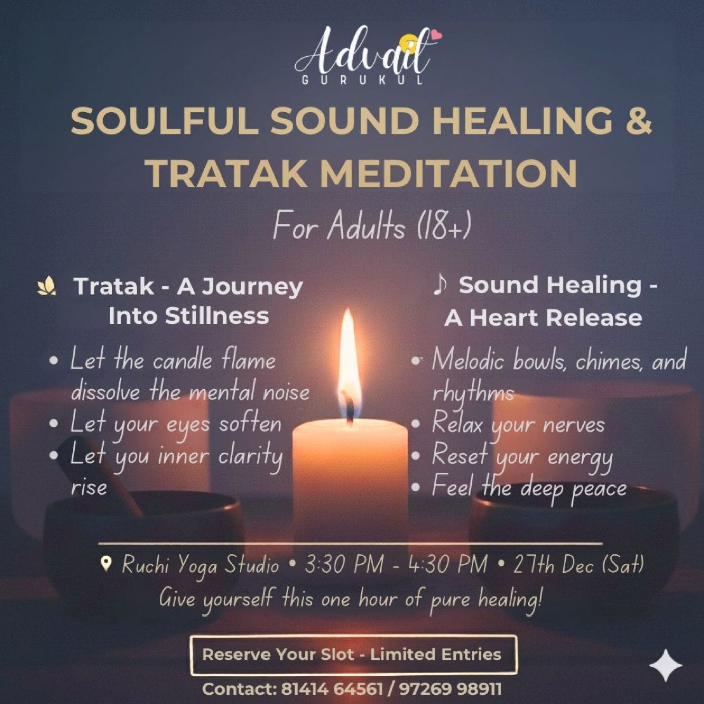 Tratak meditation invites the eyes to rest on the flame. As the gaze steadies, the mind naturally settles. Thoughts loosen their grip. Breathing deepens. A calm, clear awareness begins to unfold — without force, without effort. ✨