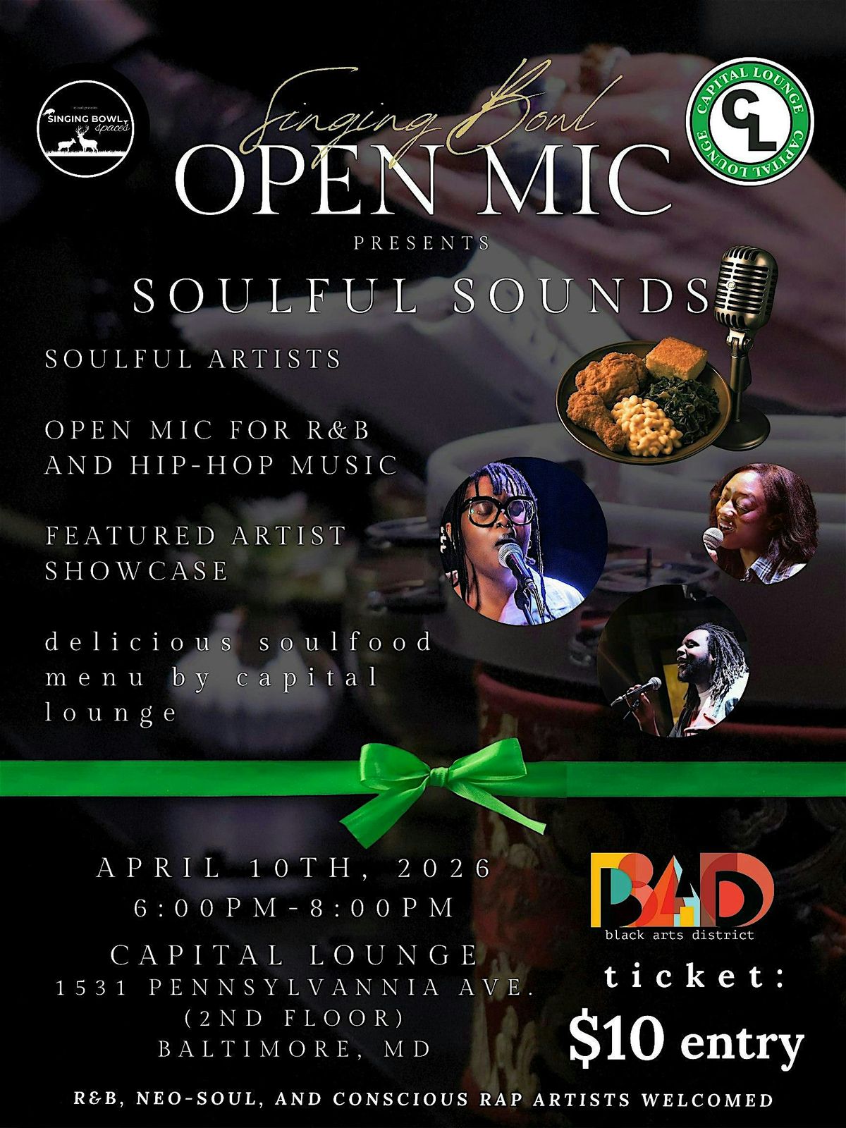 An open mic experience that blends soulful sounds with soul food. We look to nourish ourselves through soulful sounds while we nourish our bodies with delicious soul food by Capital Lounge. Artists accept virtual and cash tips. We're bringing lighting, vibes, and the reverb to the Black-owned restaurant. Ordering drinks and soul food from Capital Lounge is highly encouraged to boost the Black-owned business and keep the vibes going for generations to come. Bring yourselves and your dollars for a night of SOUL.