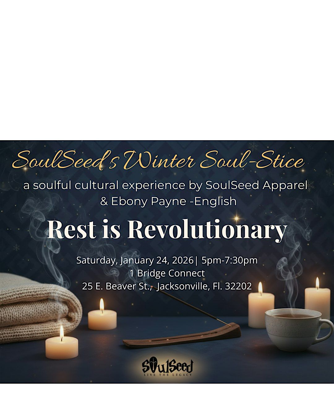 Join us for SoulSeed’s signature winter gathering, "Rest Is Revolution," an immersive evening designed to help you pause, restore, and honor the power of rest in community. Guided by Akim Wilson, you’ll experience grounding breathwork, meditation, and teachings on ancient wisdom about rest. Enjoy a powerful short film, soulful rituals, and the interactive “What I’m Not Going to Do” wall, all culminating in a special spoken word performance by Ebony Payne-English.
