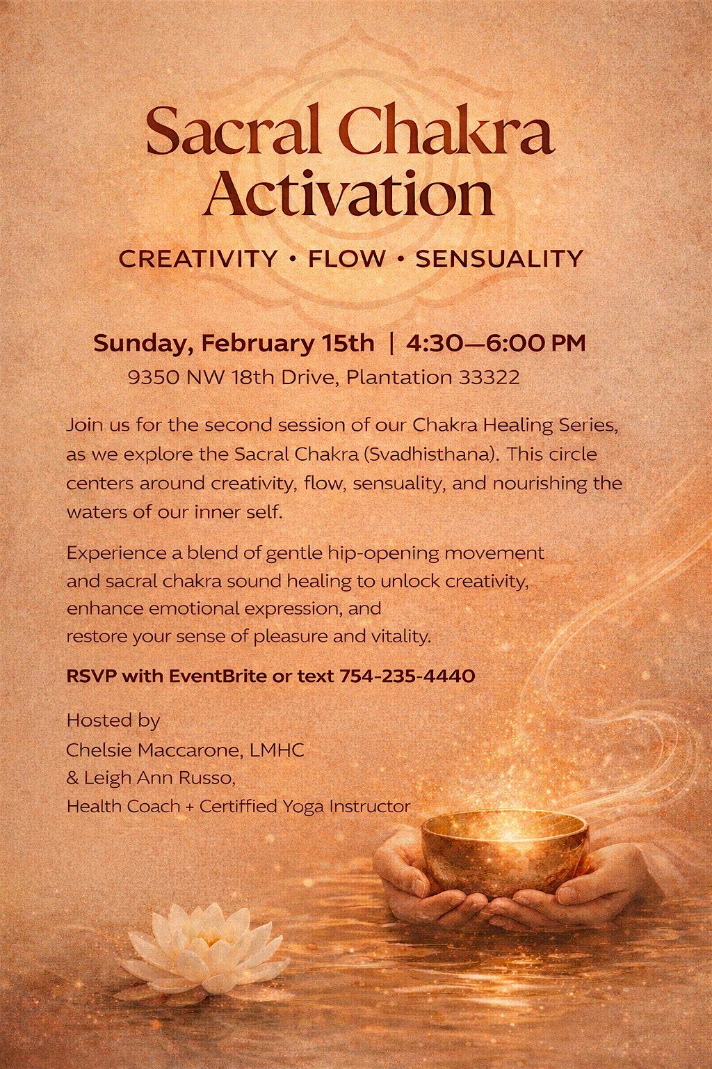 Join us in person for a unique journey into your sacral chakra through the power of sound. This session is all about unlocking creativity, passion, and emotional balance with relaxing and energizing sound vibrations. Perfect for anyone looking to tune into their inner flow and boost their well-being. Come ready to feel, move, and activate your energy center!