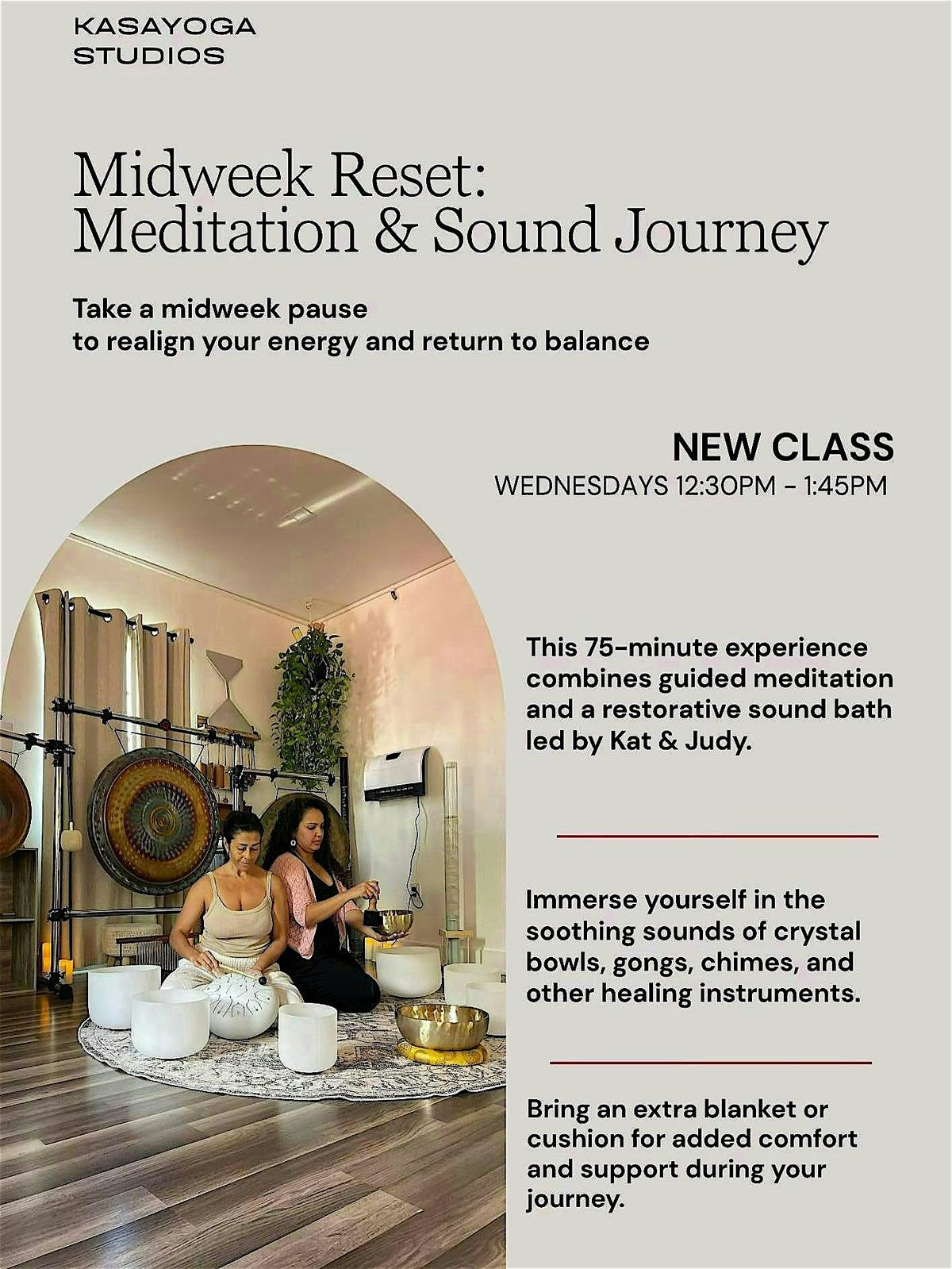 Take a midweek pause to realign your energy and return to balance. This 75-minute experience combines guided meditation and a restorative sound bath led by Kat & Judy, using crystal bowls, gongs, chimes, and other healing instruments to create a deeply soothing atmosphere.