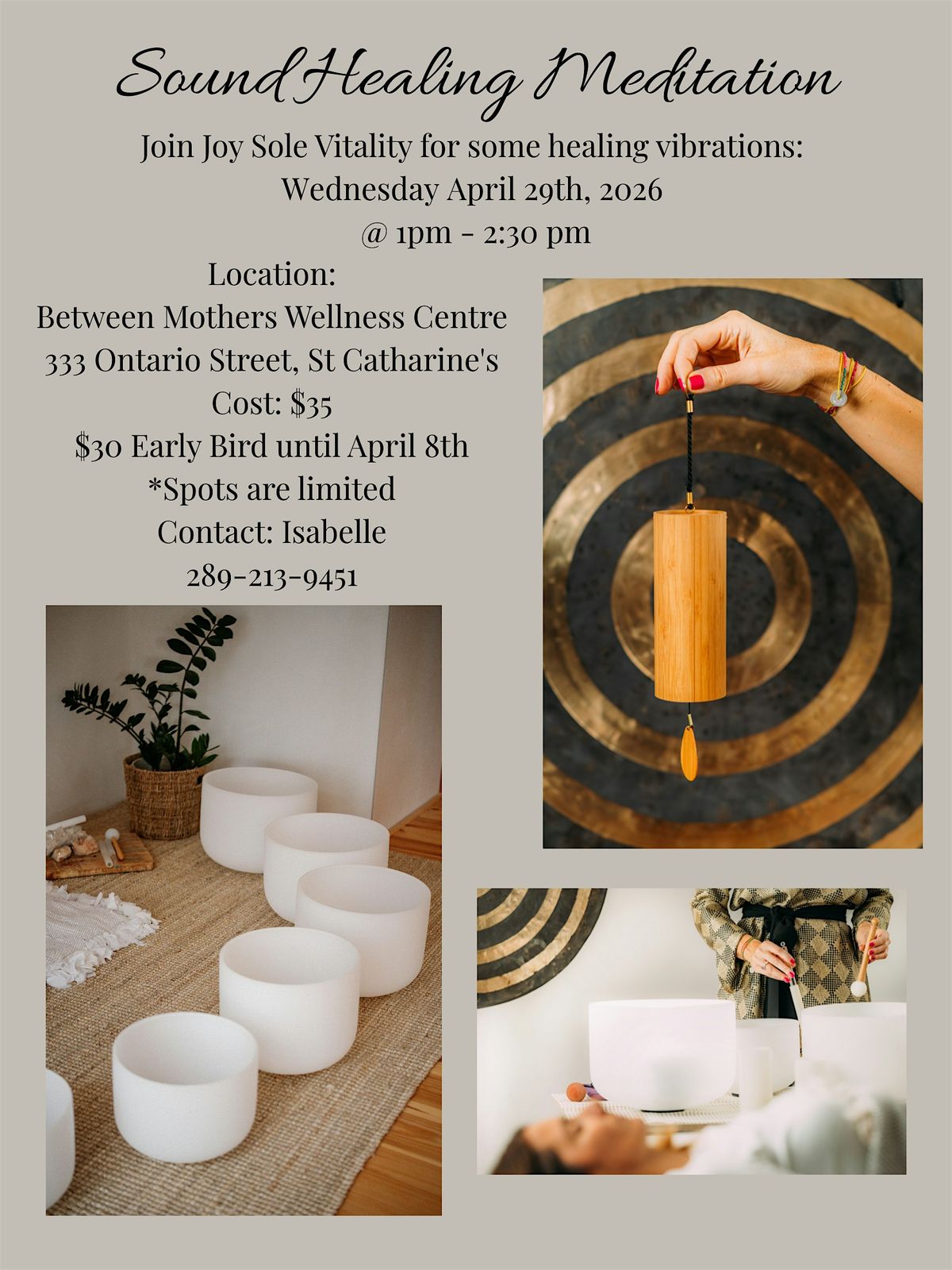 Come join us at Between Mothers Wellness Centre for a rejuvenating experience. Let the soothing sounds wash over you as you relax and unwind in a peaceful setting. Isabelle from Joy Sole Vitality will lead you through a session designed to promote healing and relaxation through the power of sound. Whether you're a seasoned meditator or new to the practice, all are welcome to participate and experience the benefits of sound healing. Don't miss out on this opportunity to nourish your mind, body, and soul!