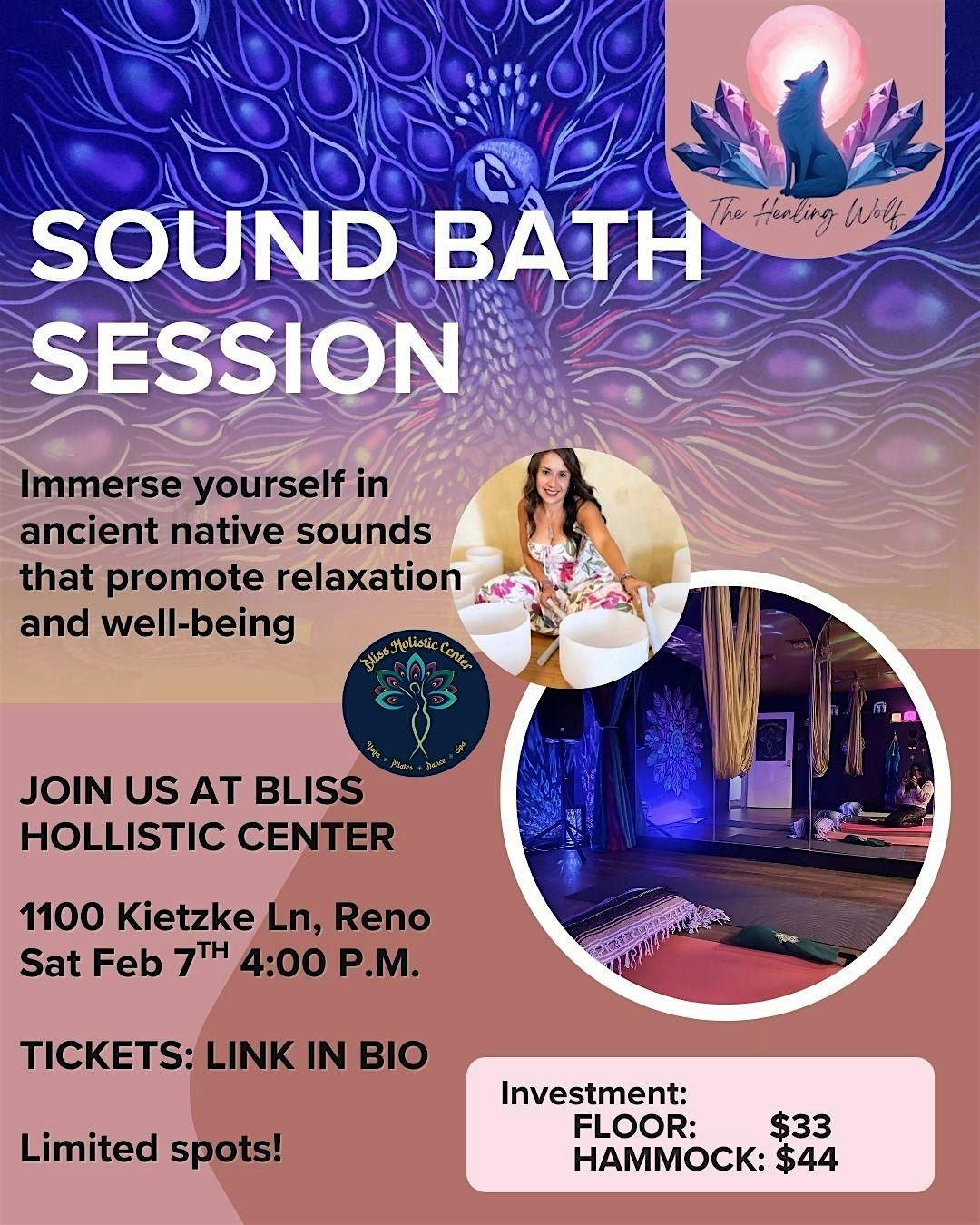 Welcome to the Sound bath session with The healing wolf at Bliss Holistic Center! Join us on February 7, 2026 at 4:00 AM (Pacific Time) **Event Overview: Sound Bath Experience**