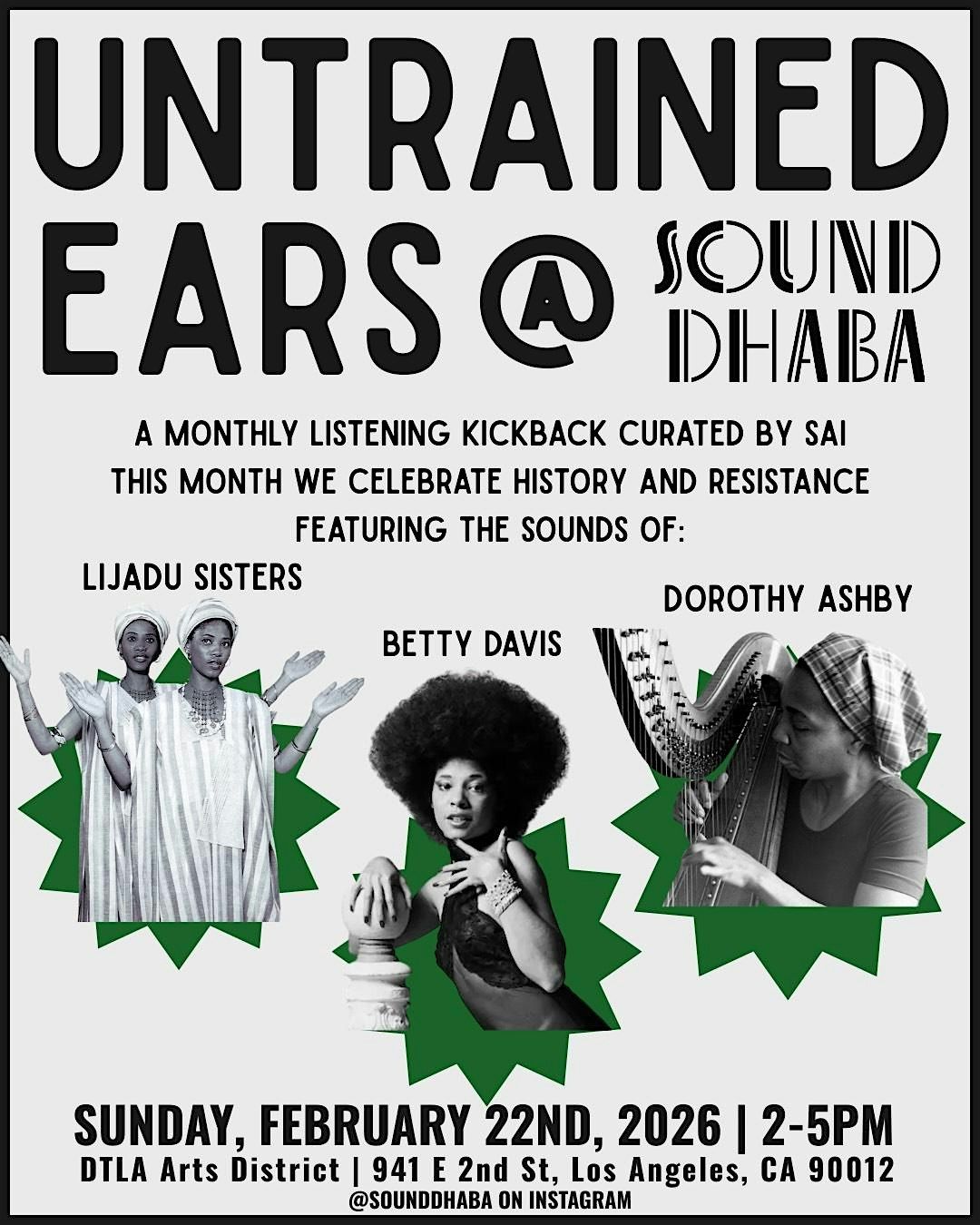 Come chill with Untrained Ears during our monthly kickback as we journey through a special curated listening session prepared by Sai. This month we are listening to the sounds of Black resistance and history with curated songs from the Lijadu Sisters, Betty Davis, and Dorothy Ashby.