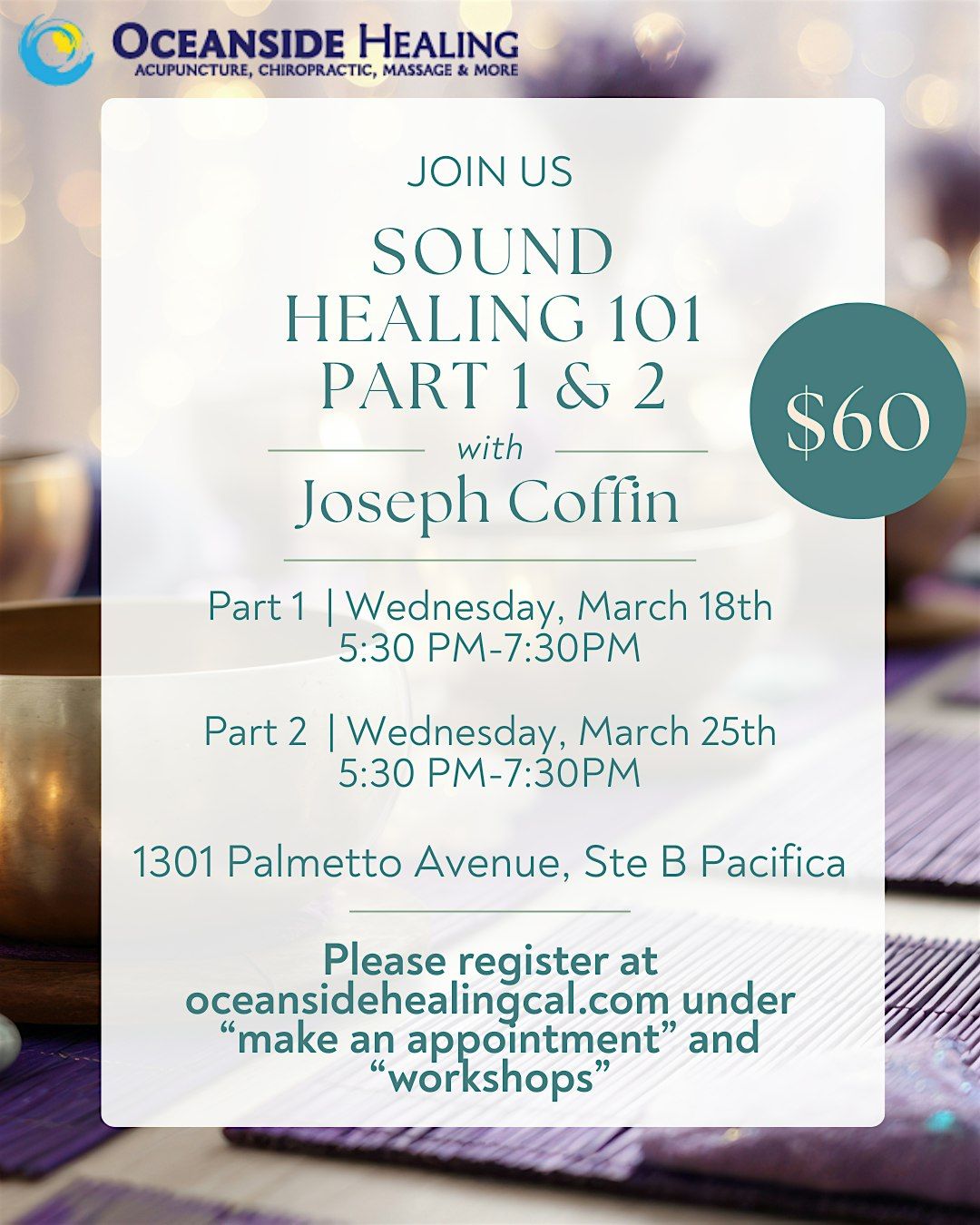 Space is limited, please sign up either on this page or at oceansidehealingcal.com, “make an appointment”, "workshops"