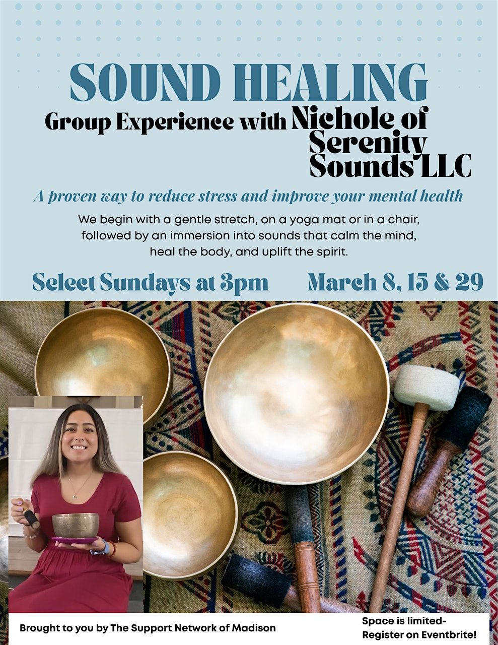 We begin with a gentle stretch, on a yoga mat or chair, followed by an immersion into sounds that calm the mind, heal the body and uplift the spirit.