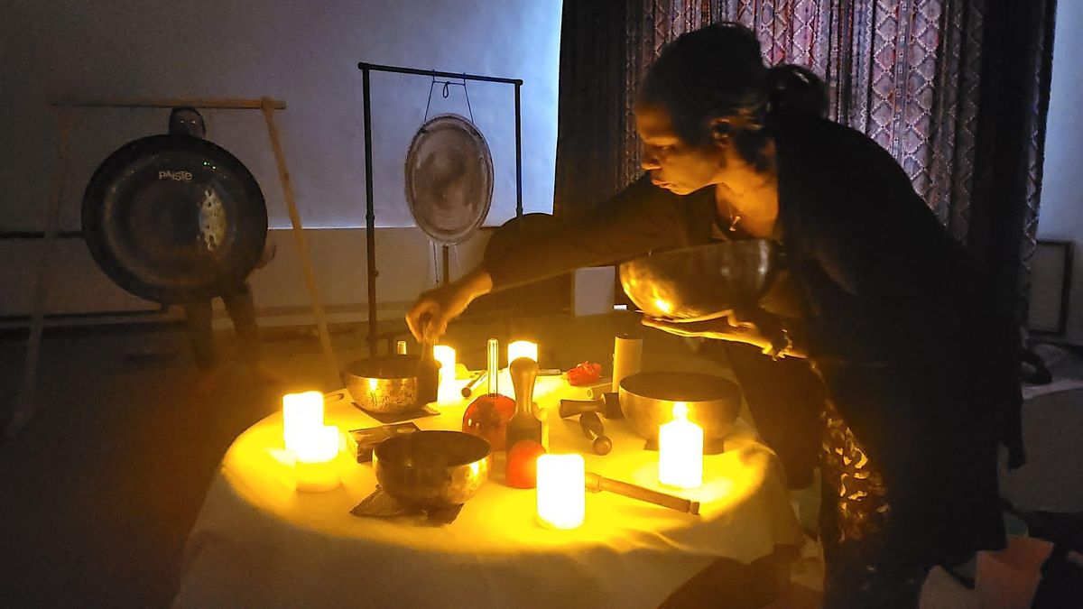 The session designed to help you relax and let go. The sound created sends you into "delta" state, as in Yoga Nidra, the state before sleep, were you can really relax and release the over active new brain, giving you access, without other stimulation to that inner connection with the self. Only receiving through Sound and Vibration, which resonance with your entire being.