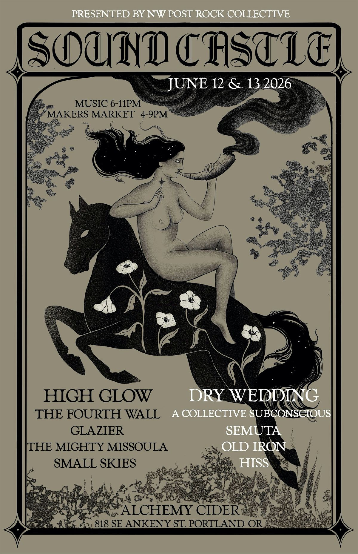 Join us at Alchemy Cider—Portland’s independently owned, darkly magical cidery (beer, wine , cocktail & N/A options)—for two days of thoughtfully curated, progressive music in a unique open-air summer setting. Featuring 10 bands across 2 days, (see lineup below) SoundCastle brings together boundary-pushing artists alongside a hand-selected maker’s market showcasing locally designed jewelry, prints, ceramics, candles, and more.
