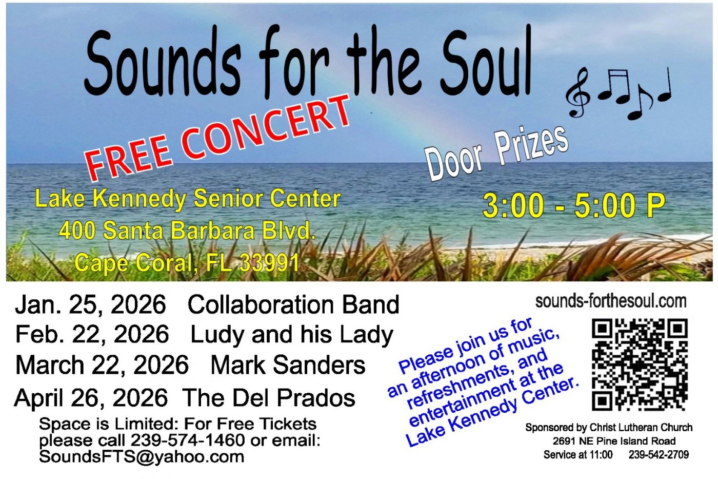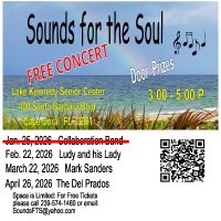 Join us for our second Free concert at the Lake Kennedy Center on Sunday, February 22, 2026 starting promptly at 3:00PM and going to 5:00PM. This time we are featuring Ludy and his Lady. For more information, visit their web page at http://ludytunesllc.com or log onto our web site at www.sounds-forthesoul.com John and Nichol Puleo will be featuring their Movie Tunes show which feature well know songs from the movies we all loved in the past. For FREE tickets you must call 239-574-1460 and leave a message on how to contact you (the phone number does not accept text messages) or send us an email to [email protected] and our ticket person will get back to you. Space is limited at the Kennedy Center, so please act now, and invite your friends also.