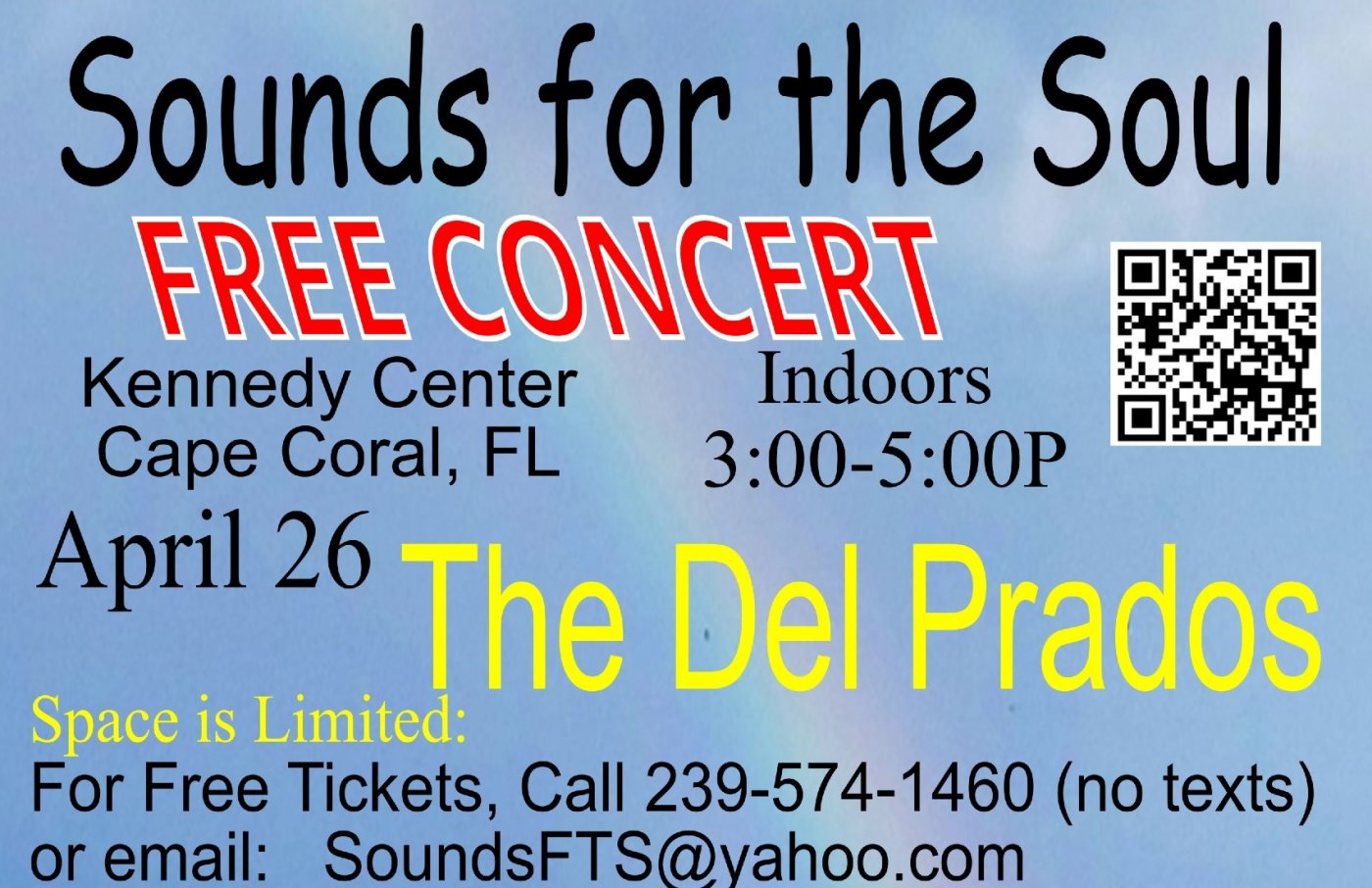 Our last concert this year brings the Del Prados to the Kennedy Center. Most of you living in Cape Coral are aware of and have heard the Del Prados perform locally. This is your chance to hear them perform for FREE on Sunday April 26 at 3:00PM. This will be a sellout event. The Kennedy Center will hold about 140 folks so tickets will be limited and will be required. So, plan to join us on Sunday, April 26 at the Kennedy Center. The concert starts promptly at 3:00PM. Tickets will be limited for this event. You must call 239-574-1460 and leave a message (no text messages) or email us at [email protected].