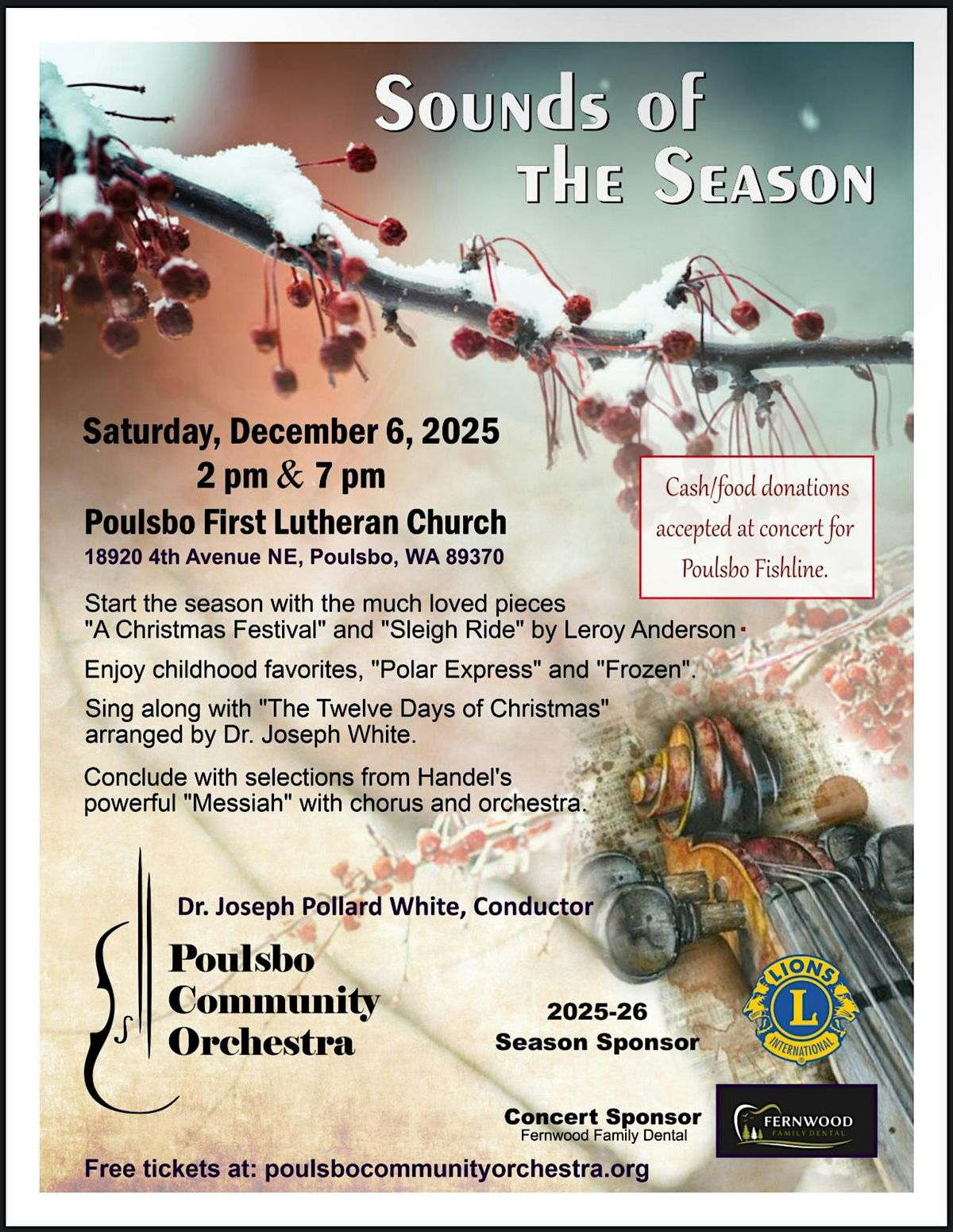 Welcome to Holiday Favorites - Family Friendly Concert! Join us at Poulsbo First Lutheran Church on December 6, 2025 at 2:00 PM for a festive musical celebration. Get ready to enjoy classic holiday tunes in a cozy and welcoming atmosphere, featuring favorites from "The Polar Express" and "Frozen." This event is perfect for the whole family to create lasting memories together. We are also collecting donations for Fishline - please check Most Needed Items - Fishline to see what's needed most. We can't wait to see you there!