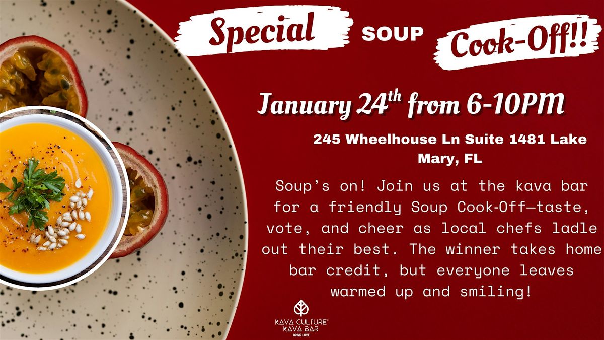 Soup’s on! Join us at the kava bar for a friendly Soup Cook‑Off—taste, vote, and cheer as local chefs ladle out their best. The winner takes home bar credit, but everyone leaves warmed up and smiling!