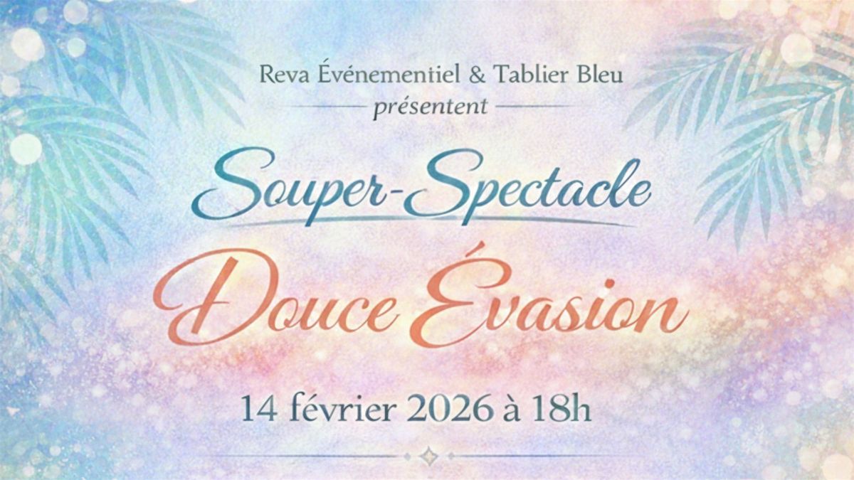 Viens te régaler lors du SOUPER-SPECTACLE << DOUCE ÉVASION >>! Une soirée pleine de bonne humeur, de délices et de moments magiques. Laisse-toi emporter par une ambiance chaleureuse et conviviale, parfaite pour se détendre et partager un moment unique avec des amis ou la famille. Ne manque pas cette expérience inoubliable qui promet de te faire voyager sans prendre l'avion ou le bateau.