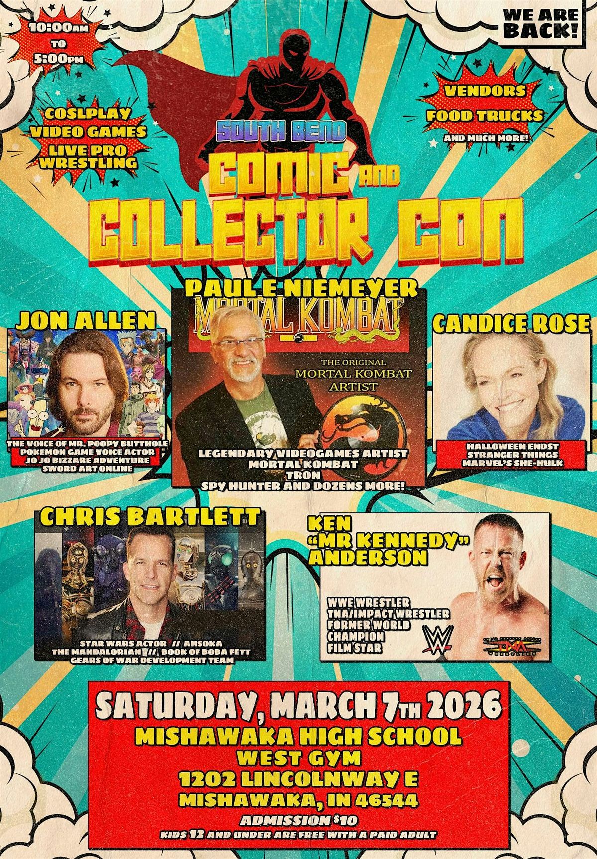 Get ready for an epic adventure at the South Bend Comic and Collectors Con 2026! Dive into a world of comics, collectibles, pro-wrestling, cosplay, anime and all things geeky. Meet fellow fans, hunt for rare treasures, and enjoy a fun-filled day celebrating your favorite fandoms. Whether you're a casual fan or a hardcore collector, this con is where the magic happens!
