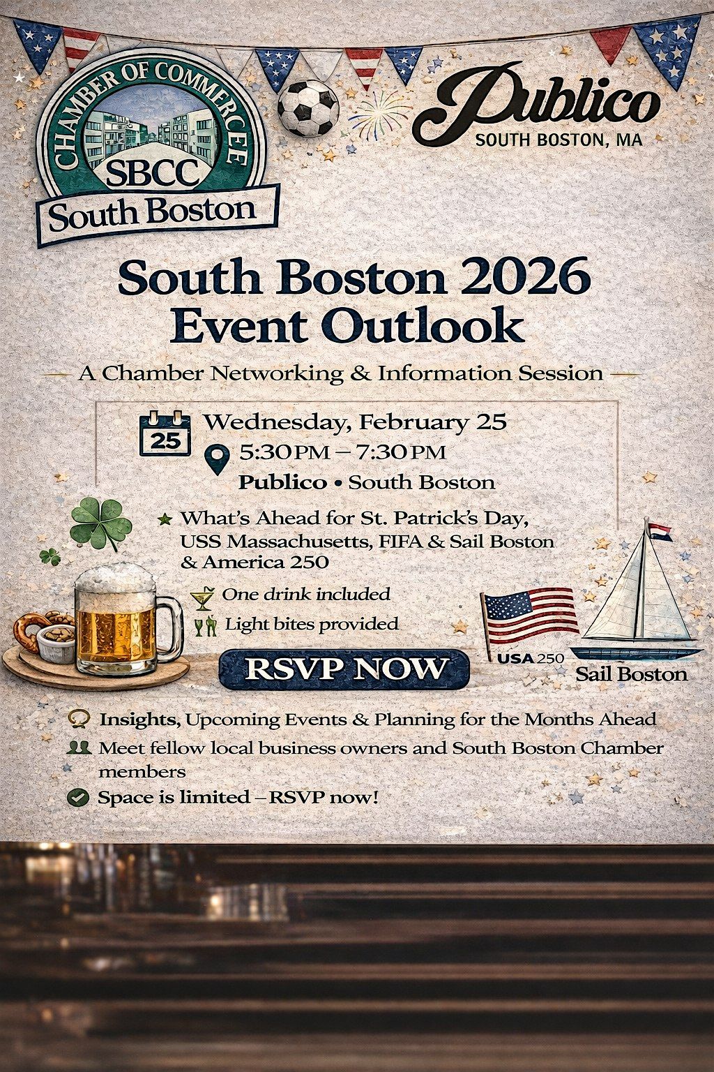 As we gear up for some of the biggest moments on the calendar — St. Patrick’s Day, the USS Massachusetts Submarine Commissioning, FIFA events, America’s 250th Birthday, and Sail Boston — this event is the perfect opportunity to learn how to get involved, collaborate, and stay connected to what’s ahead. Enjoy one complimentary drink, light bites, and great conversation in one of South Boston’s favorite spots.