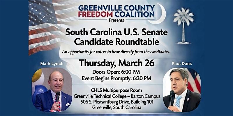 Join the Greenville County Freedom Coalition for an exclusive roundtable discussion featuring South Carolina Republican U.S. Senate Candidates Mark Lynch and Paul Dans. This is a unique opportunity for voters across the Upstate to hear directly from the candidates on critical issues facing South Carolina and the nation. Tara Servatius who hosts The Tara Show on News/Talk 98.9 WORD (WYRD-FM) in the Upstate of South Carolina will moderate a roundtable followed by a Q&A session featuring selected presubmitted questions from attendees.