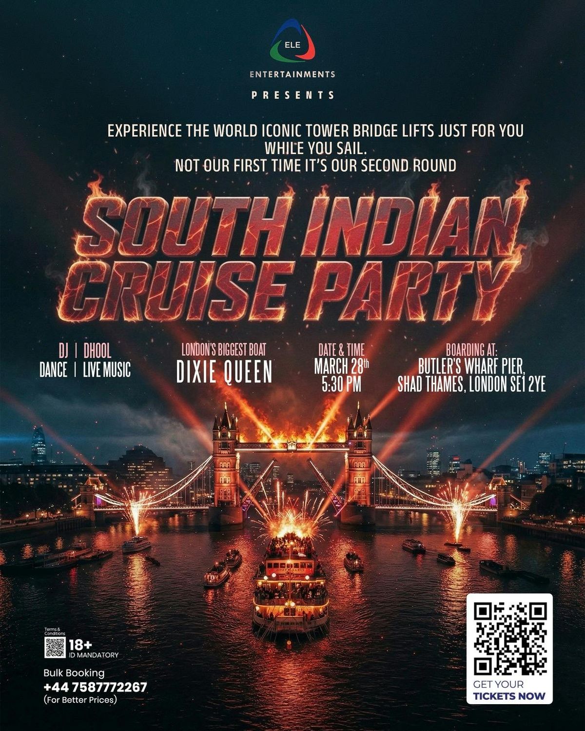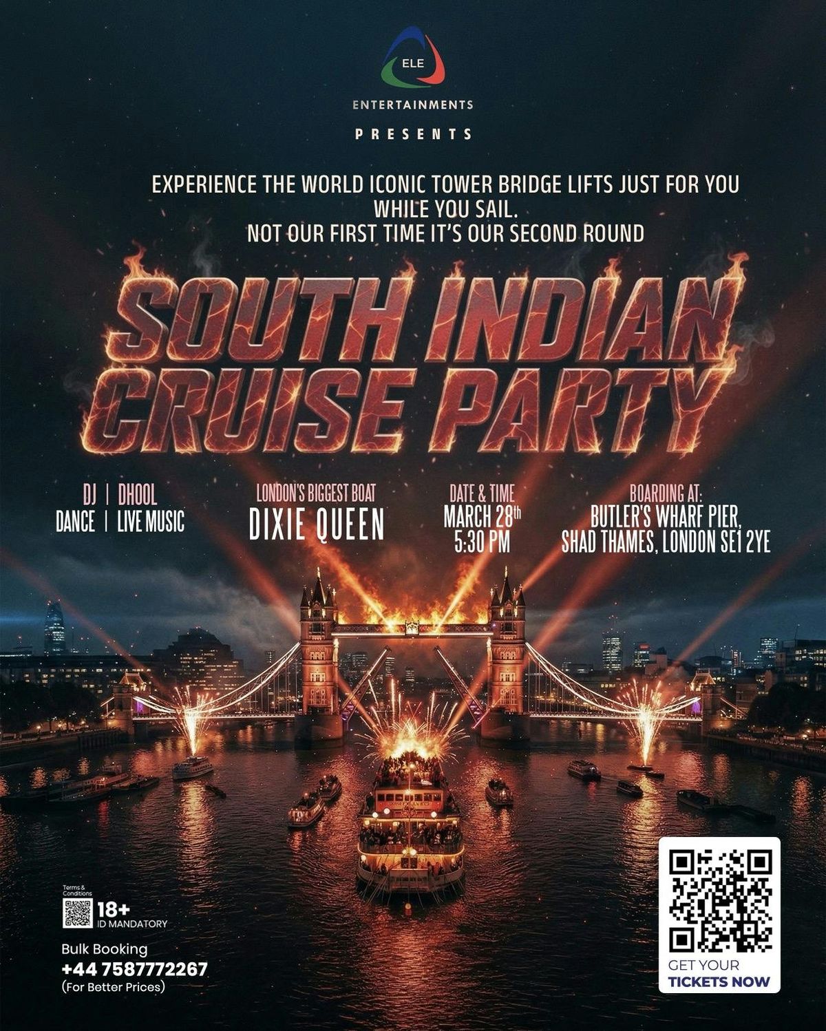 🔥🚢 SOUTH INDIAN CRUISE PARTY 🚢🔥London… we’re doing it AGAIN — and this time it’s BIGGER, LOUDER & CRAZIER! 🌉✨Watch the iconic Tower Bridge lift as we sail through the Thames in style. A once-in-a-lifetime party moment you don’t want to miss!