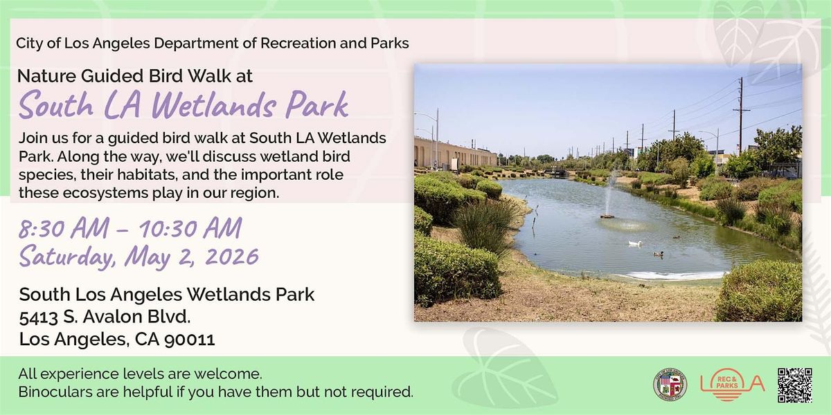 Join us for a guided bird walk at South LA Wetlands Park. Along the way, we'll discuss wetland bird species, their habitats, and the important role these ecosystems play in our region. All experience levels are welcome. Binoculars are helpful if you have them but not required.
