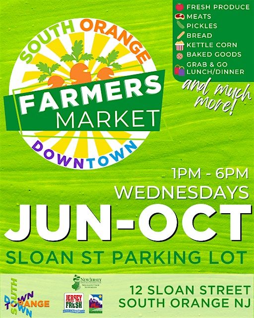 Join South Orange Downtown to kick off the 34th season of the Farmers Market beginning Wednesday, June 4 with new hours from 1–6PM in the Sloan Street Parking Lot, South Orange, NJ — and continuing every Wednesday, rain or shine, through October 29.