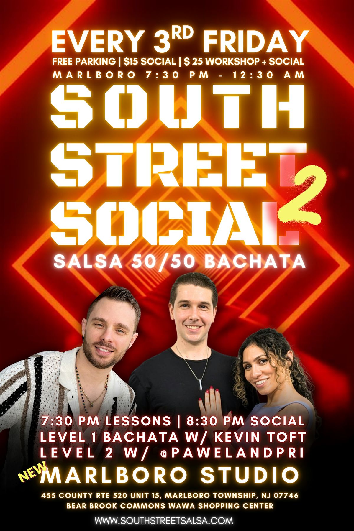 Come celebrate the launch of our newest location with a 50/50 Salsa & Sensual Bachata Social, featuring:✨ $ 25 workshop + social --$15 Entry Just social -- FREE FOR MEMBERS✨ 7:30 PM Level 1 Bachata w/ Kevin Toft✨7:30 PM Level 2 Sensual Bachata w/ @pawelandpri✨ Social dancing starts at 8:30PM!📍 455 County Rd 520, Unit 15, Marlboro, NJ (Wawa Shopping Center) - https://g.co/kgs/SVpKjyu🅿️ Free parking | 💧$1 Water