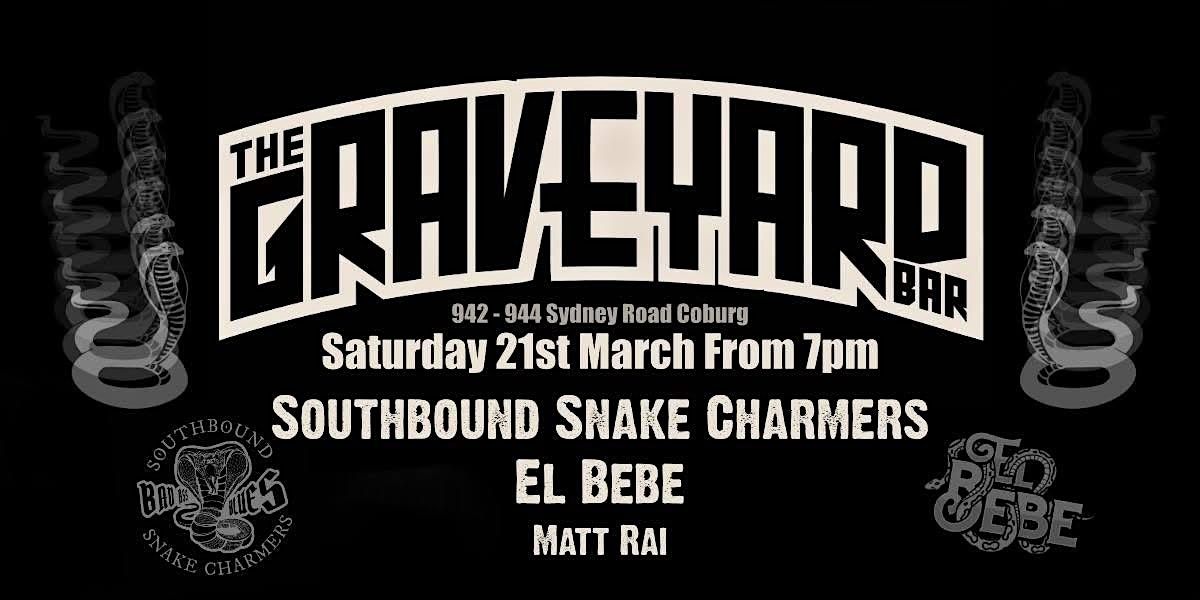 Join us at The Graveyard for 3 legends. Southbound Snake Charmers for all ya blues, El Bebe to rock you out and Matt Rai to croon your ears.