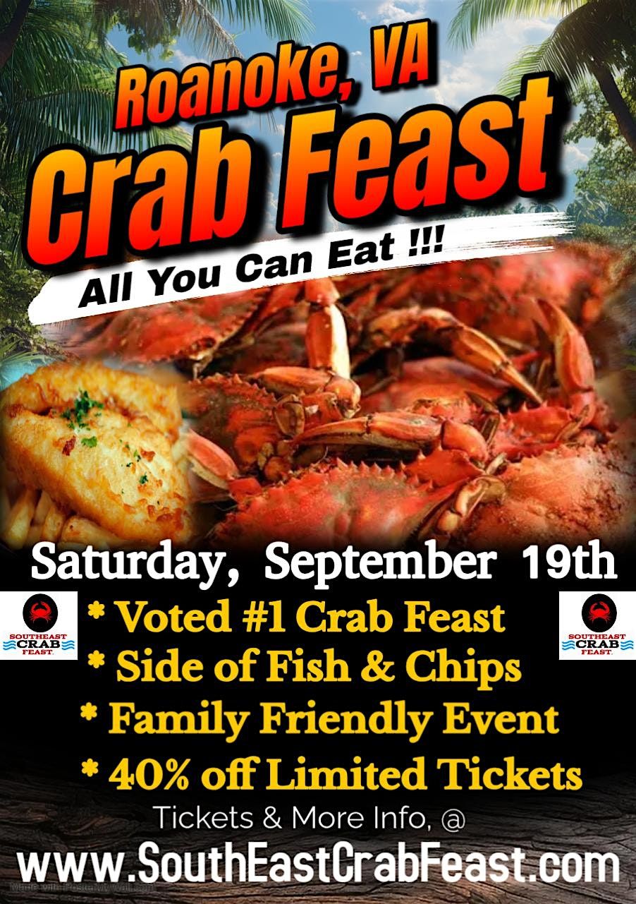 ALL YOU CAN EAT BLUE CRABS!!!! Please join us for the SouthEast Crab Feast event in Roanoke, VA on Saturday, September 19th. This event offers the Low Country Coastal Heritage of outdoor cooking of fresh seafood. This highly acipated event will offer ALL YOU CAN EAT fresh Blue Crabs, one side of Fish & Chips, Music and a Family Friendly Environment for the entire family.