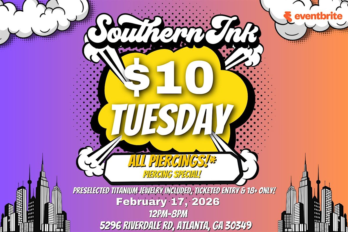 Welcome to Southern Ink, Atlanta! Join us for our special event: $10 Tuesday piercing special happening on February 17, 2026 at 12:00 PM at Southern Ink Atlanta: Tattoos and Piercings. Get ready for some amazing deals on piercings! Don't miss out on this opportunity to get a new piercing or add to your collection. See you there!