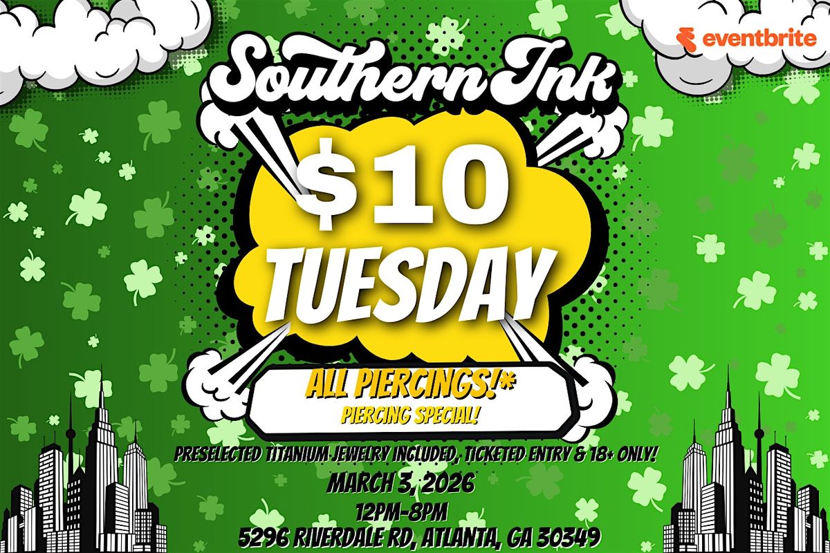 Welcome to Southern Ink, Atlanta! Join us for our special event: $10 Tuesday piercing special happening on March 3, 2026 at 12:00 PM at Southern Ink Atlanta: Tattoos and Piercings. Get ready for some amazing deals on piercings! Don't miss out on this opportunity to get a new piercing or add to your collection. See you there!