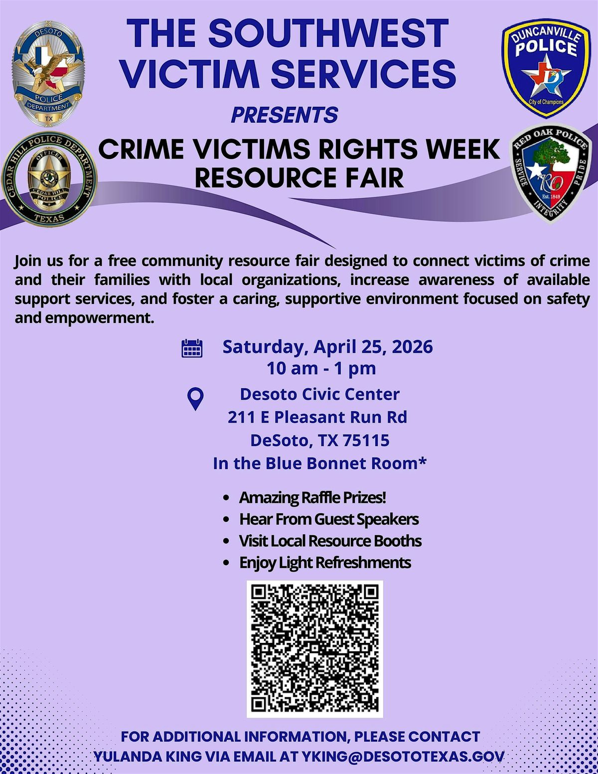Southwest Victim Services is hosting the Crime Victims' Rights Week Resource Fair. Join us for a free community resource fair designed to connect victims of crime and their families with local organizations, increase awareness of available support services, and foster a caring, supportive environment focused on safety and empowerment. This event is located at the Desoto Civic Center in the Bluebonnet room. For additonal information, please contact Yulanda King via email at [email protected].