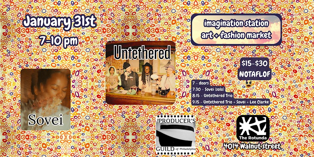 The Producers Guild presents a genre crossing concert, feat. Sovei, The Untethered Trio, + Imagination Station Art/Fashion Market. The event Celebrates the release of Untethered Trio's newest Album "Phronesis" to be released on feb 6, with advanced copies available at the event. The evening will start with an intimate solo performance by guitarist and singer songwriter Sovei. Followed by a set by Unthered Trio, and ending with a collaboration with Sovei and Lee Clarke joining the group on stage for a spontenous adventure ! Along with the concert, the Imagination Station will showcase local artists and fashion designers, including Carl Trunk, Gerald Brown, Scott Procelli, Mary T Bevlock and Paige Donovan.