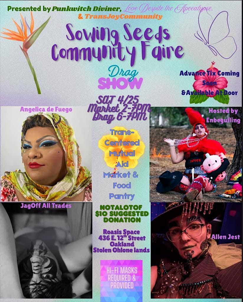 Join us SAT 4/25 2-7PM ✨🌱🌷at 436 E 12th St, Oakland for a mutual aid market , food pantry and drag show featuring all-Trans vendors and talent. ⚧️🏳️⚧️ Spend a sunny day with community and loved ones, donate and/or partake in our food pantry, and stay to watch some amazing local drag ☀️💜