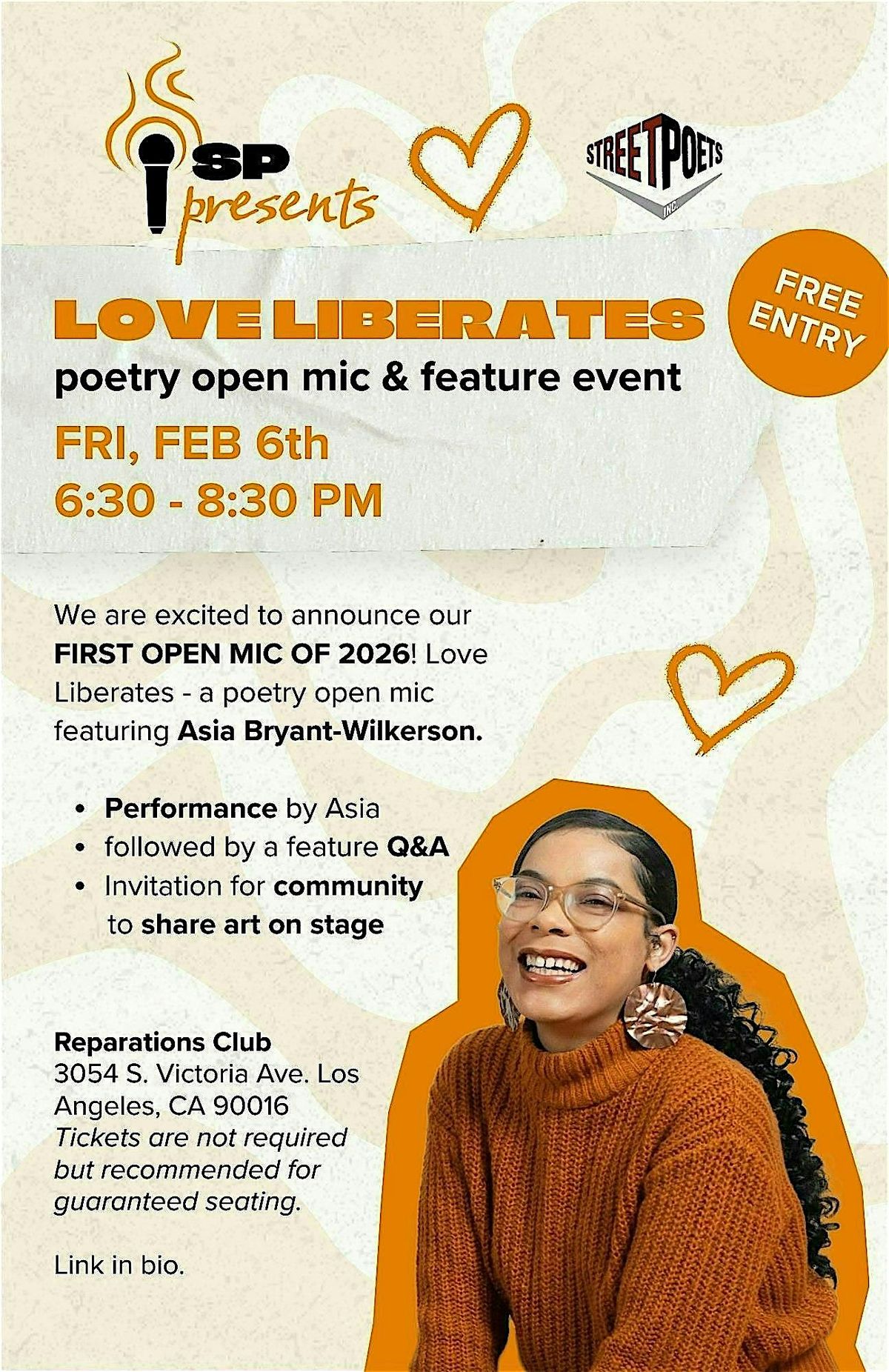 Dear Street Poets Community, we are excited to announce our FIRST OPEN MIC OF 2026! Friday, Feb 6th at Reparations Club: SP Presents: Love Liberates - a poetry open mic featuring Asia Bryant-Wilkerson