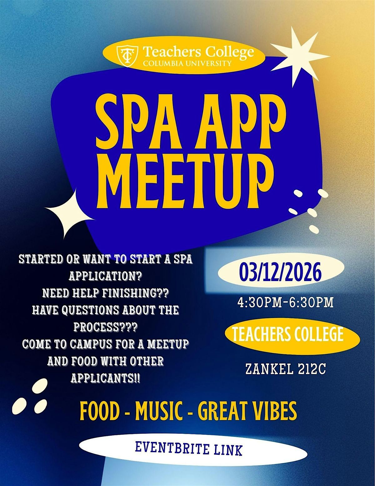 Grab your laptop and come to Teachers College on March 12 and enjoy free food and beverages while meeting your potential classmates! There'll be a couple of games and current students to help you get your application submitted.