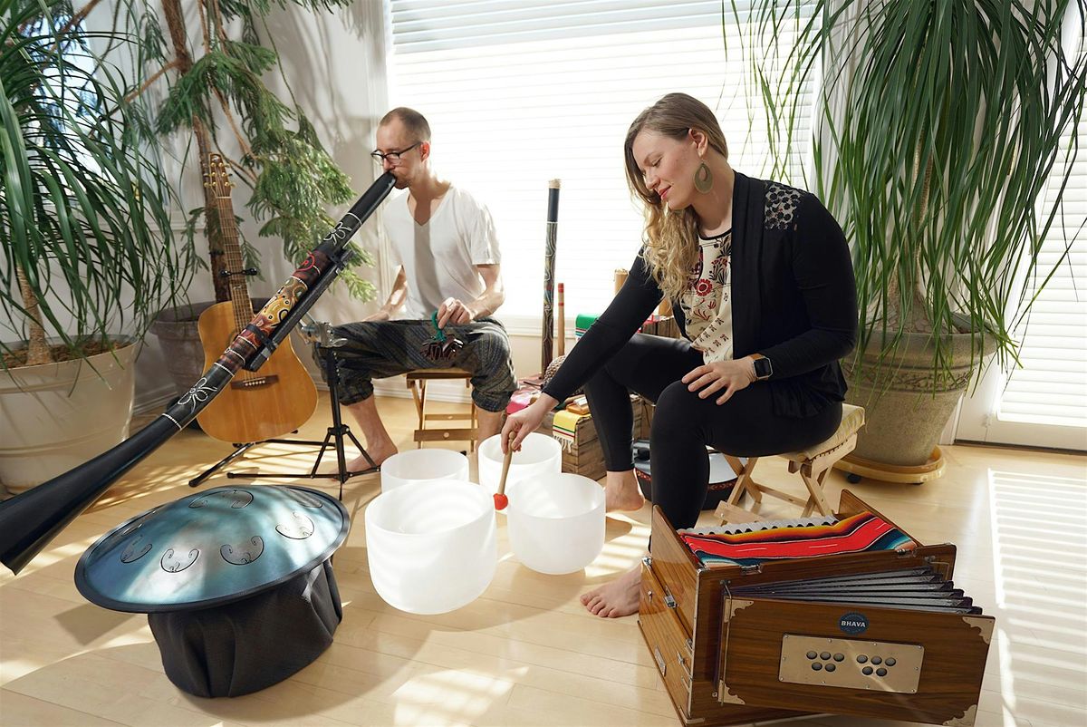 For those that would like an extra immersive experience, make sure to reserve a front row immersion ticket for a heightened vibrational journey. As you lie on your yoga mat or sit in meditation, Nathan and Ada will move around and over your body to bring the healing vibrations of the instruments close and surround you in sound.