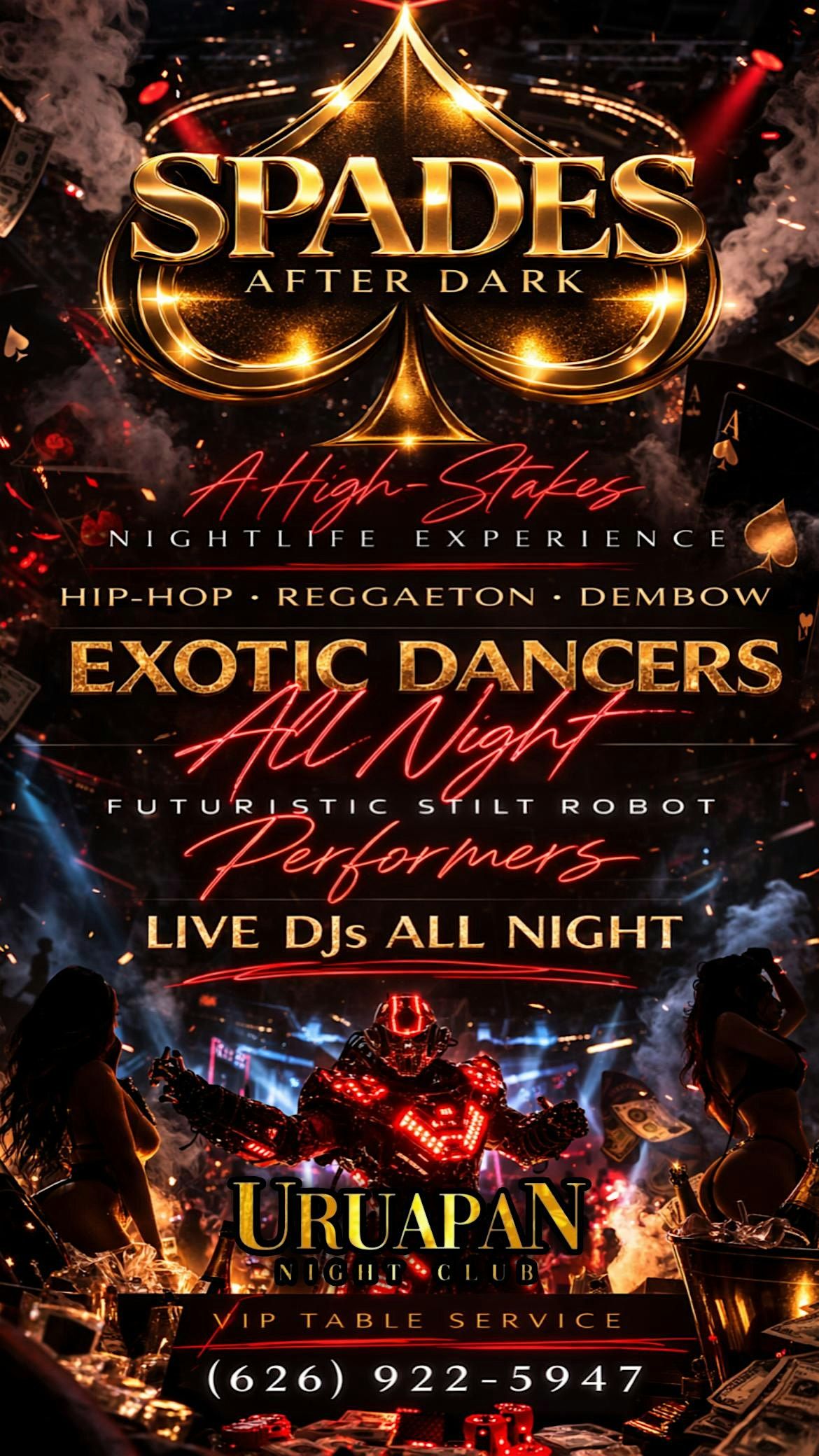 Step into a high-stakes nightlife experience where the energy never stops. Uruapan Night Club transforms into a Vegas-style party featuring live DJs spinning hip-hop, reggaeton & dembow all night, exotic dancers, and futuristic robot stilt performers lighting up the dance floor.