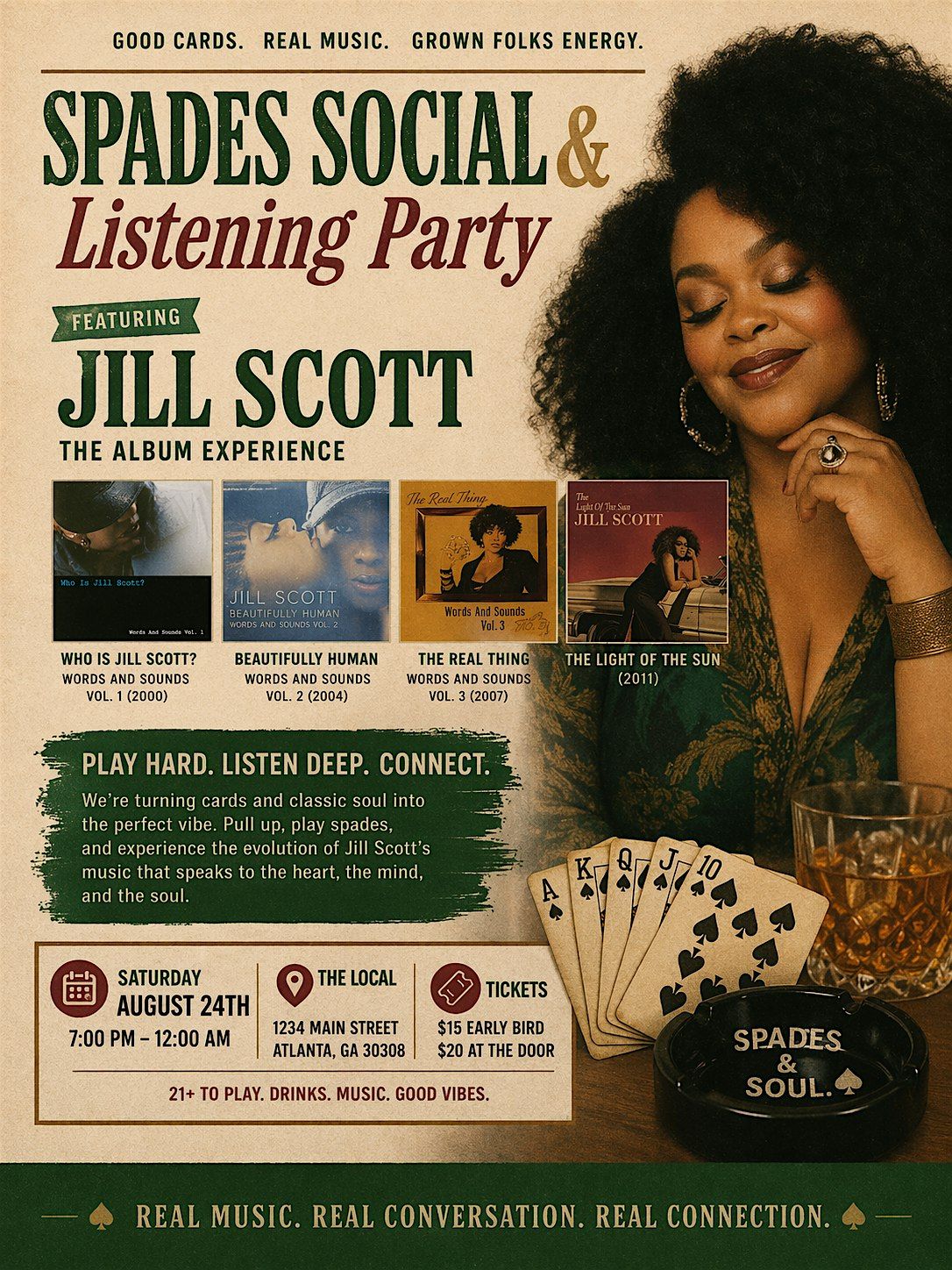 PremiumSpades Spades + Soul Socials featuring the unofficial listening party for three-time GRAMMY Award-winning singer, songwriter, actress and cultural force Jill Scott as we ceebrate her highly anticipated To Whom This May Concern World Tour.