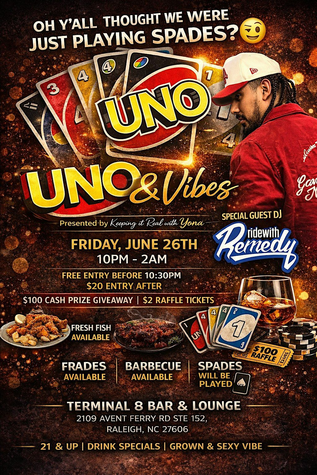 $100 cash giveaway-$2 raffle ticket, UNO, Spades, BBQ , Dj Remedy and Vibes