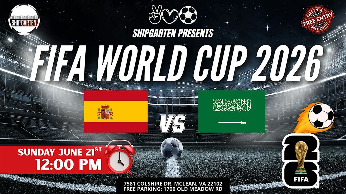 SUNDAY SHOWDOWN. CONTROL VS INTENSITY. Spain brings possession, precision, and World Cup pedigree.Saudi Arabia brings speed, discipline, and fearless energy. 12PM kickoff.Midday match. Full stadium atmosphere. Shipgarten becomes the biggest World Cup watch party in Tysons. THIS IS HOW YOU WATCH A SUNDAY MATCH You get here early.You grab your crew.You lock in before kickoff. Massive screens & stadium-level sound $40 Mix & Match Beer Buckets (5 – 16oz cans) 100+ beer varieties available All ages welcome (21+ to drink) The most energetic World Cup crowd in Tysons This isn’t background noise. It’s full matchday energy. TECHNIQUE MEETS DETERMINATION Spain’s rhythm and tactical control.Saudi Arabia’s pace and counterattack power. Sunday at noon means the energy starts early and doesn’t slow down. Come early. Stay loud. Celebrate every goal. GAME DAY DETAILS Sunday, June 21st Kickoff: 12:00 PM Shipgarten – 7581 Colshire Dr, McLean, VA 22102 FREE & large parking at 1700 Old Meadow Rd FREE ENTRY – Pay only for what you consume Coming with your crew? Upgrade your match day. More Info Click Here The biggest crowd. The coldest beer. The loudest World Cup in Tysons.