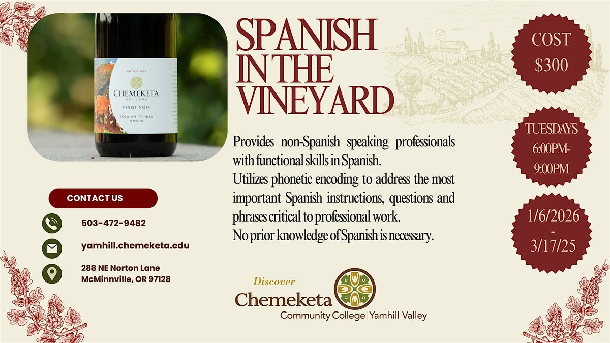 This course introduces the practical use of Spanish in vineyard environments, emphasizing why Spanish is an essential tool for effective communication in vineyard operations. Students will learn to use basic instructions, questions, and work-related phrases in Spanish, while also developing the ability to understand clearly spoken Spanish and respond appropriately in job-specific contexts.