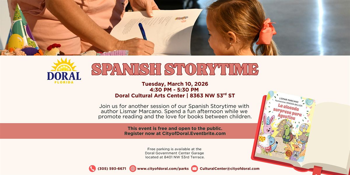 Come and enjoy a fun and engaging afternoon at the Doral Cultural Arts Center. Join us for another session of our Spanish Storytime with author Lismar Marcano as we read La alocada sorpresa para Agustina, a playful and imaginative story filled with surprises.