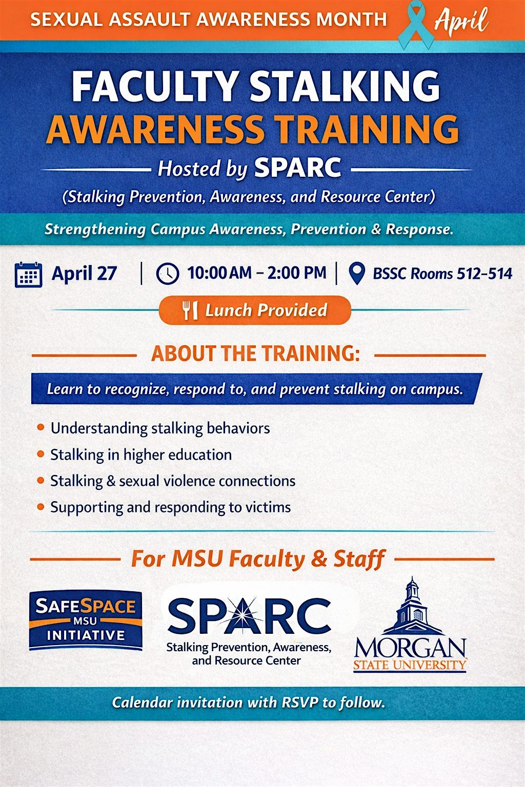 Join us in person for a hands-on session all about stalking awareness tailored specifically for faculty members. This training will help you recognize the signs, understand the risks, and learn practical steps to stay safe on campus. It's a great opportunity to get informed, ask questions, and connect with others who care about creating a safer environment. Don’t miss out on this important and eye-opening experience!