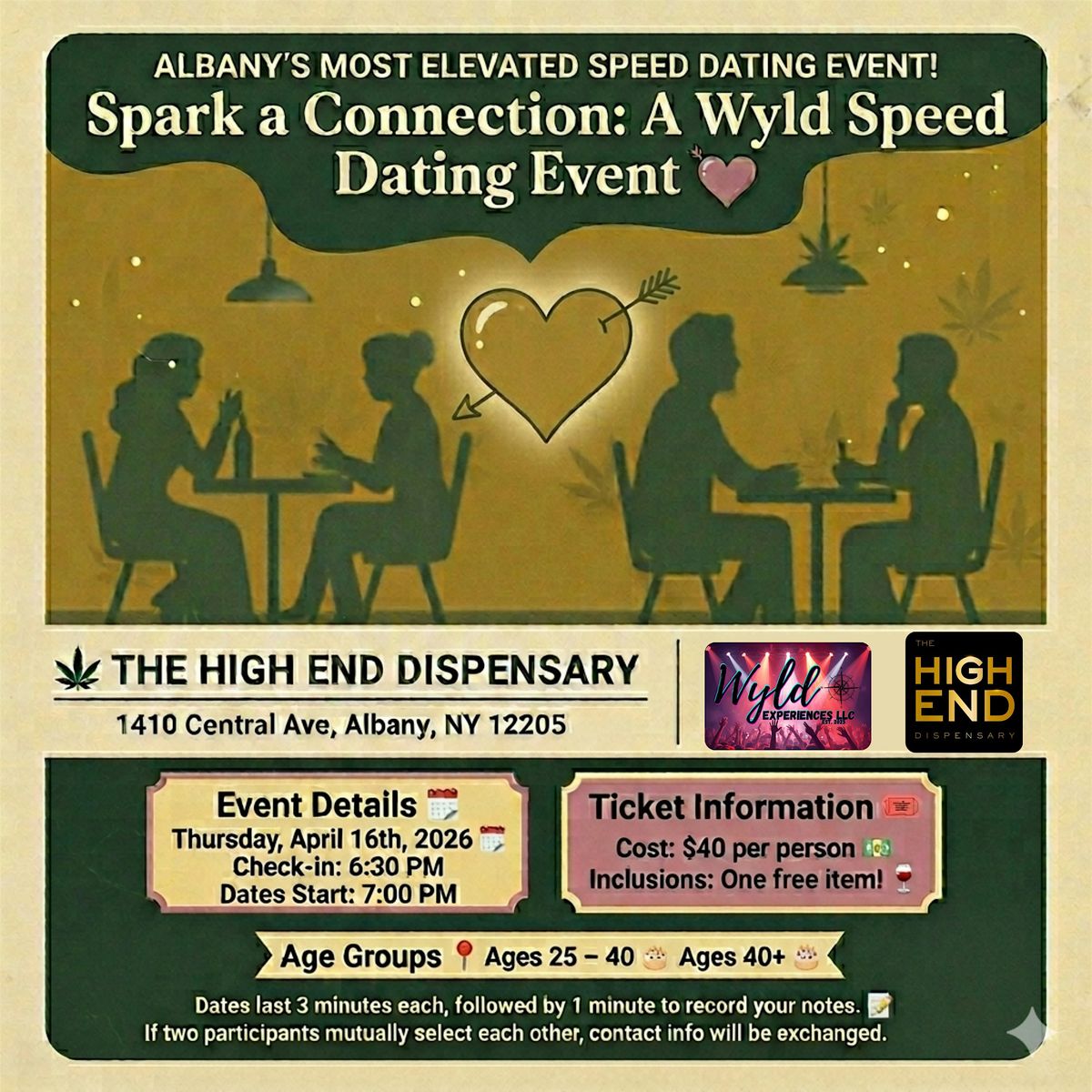 Whether youβre looking for the Cheech to your Chong or youβre just ready to get back into the real-world dating scene, this organized event takes the guesswork out of meeting new people. Hosted at The High End Dispensary in Albany, our structured 3-minute dates offer a low-pressure way to spark a brand-new connection!