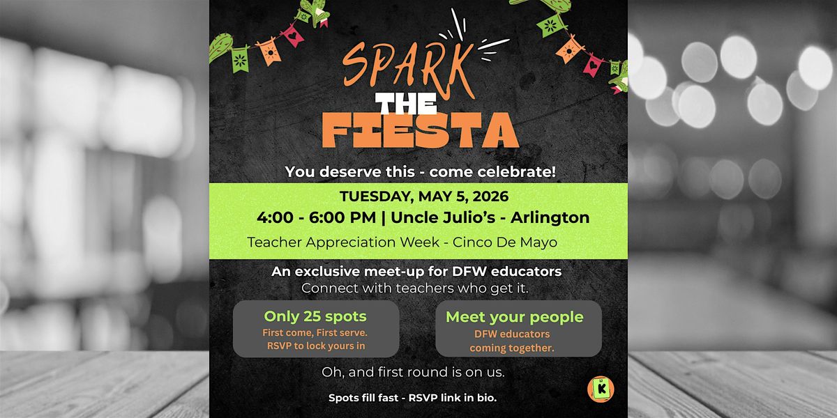 Spark the Fiesta is an exclusive Cinco de Mayo happy hour designed for DFW teachers, educators, and school staff who deserve to be celebrated — and connected.