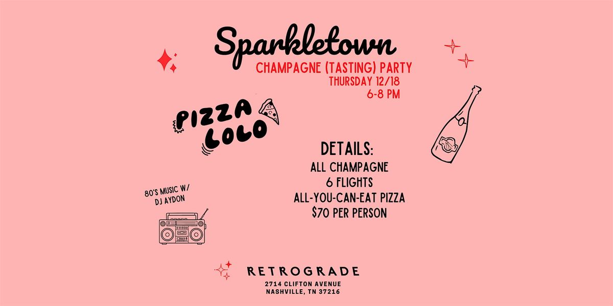 Sparkletown: Six Champagne flights, all-you-can-eat Pizza Lolo, and 80’s bangers from DJ Aydon. Come sparkle, sip, and slice.About this Event