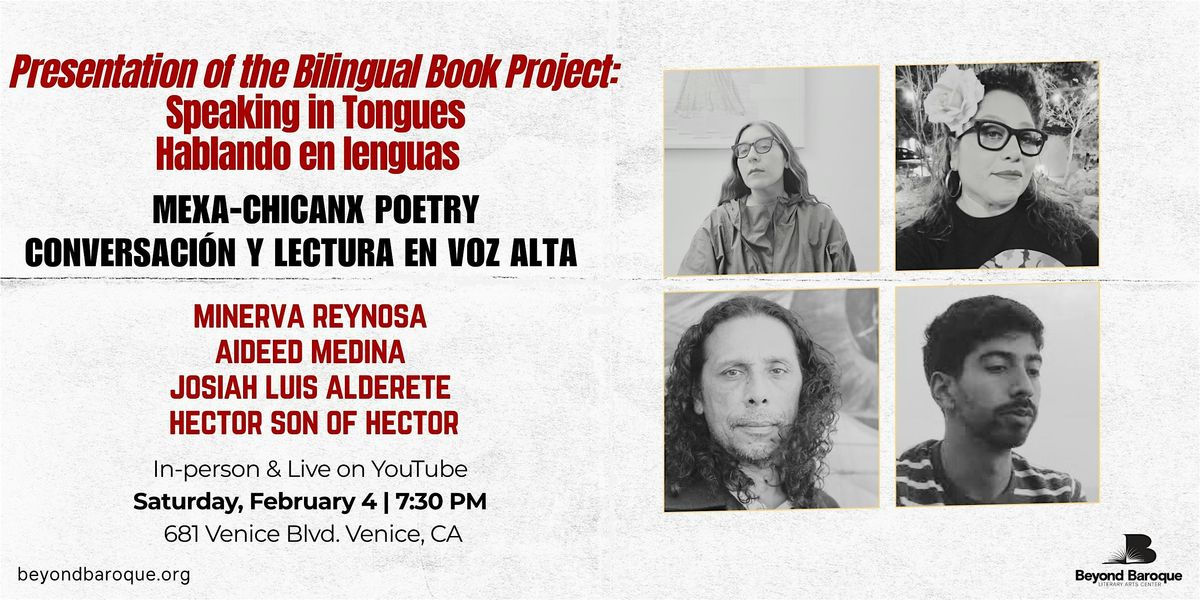 Beyond Baroque presenta la colección binacional Speaking in Tongues / Hablando en Lenguas: Poesía Mexa-Chicanx, integrada por cuatro libros que reúnen a ocho poetas mexas y chicanxs que escriben y se traducen entre el español, el inglés y el spanglish. La colección aborda temas como migración, territorio, frontera, lenguaje, política, memoria y amor.