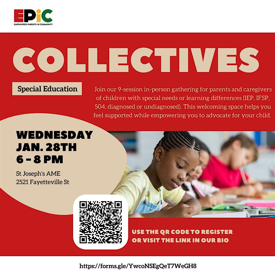 Join us for an in-person gathering where passionate individuals come together to share ideas, resources, and experiences in the world of special education. This is a 9-session program, that brings parents/caregivers together of children with learning differences to build community, strengthen knowledge, identify causes and take coordinated action for navigating special education systems.Whether you're a teacher, parent, or advocate, this is your space to connect, learn, and grow. Don't miss out on the chance to be part of a supportive community making a real difference! Please use QR code or web address below to register so we can prepare for childcare and dinner.