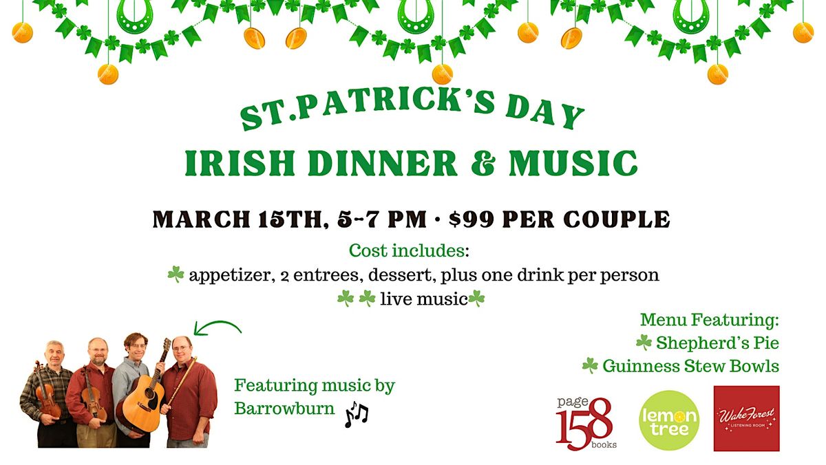 Page 158 Books, along with The Lemon Tree and The Wake Forest Listening Room are excited for the return of our Irish Music and Dinner event. Join us Sunday March 15th to celebrate St. Patrick’s Day (as well as Page 158 Books owner Suzanne Lucey's and The Lemon Tree owner Stacey Moritz's birthdays). The evening will feature Irish music and dinner; with a menu provided by The Lemon Tree and music by Barrowburn.