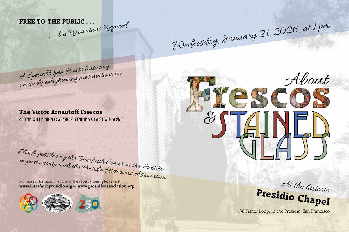 The Interfaith Center at the Presidio (ICP) and the Presidio Historical Association (PHA) are pleased to announce a special guided viewing of the historic Presidio Chapel, Willemina Ogterop stained-glass windows, and Victor Arnautoff fresco.
